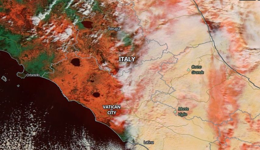 Por otra parte una borrasca mediterránea empujaba aire húmedo hacia las costas occidentales de la Península Itálica dejando precipitaciones y nevadas en Italia. Y en estas condiciones nevó en Roma.