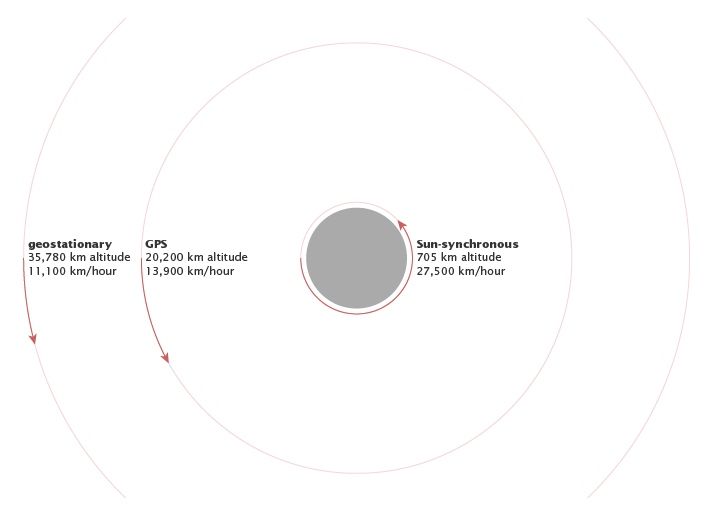 Como se ve en la ilustración anterior, la altura de la órbita afecta la velocidad con la que se mueven los satélites. A medida que los satélites se acercan a la Tierra, la atracción de la gravedad se fortalece y se mueven más rápido. El satélite Aqua de la NASA, por ejemplo, requiere alrededor de 99 minutos para orbitar la Tierra a unos 705 kilómetros (órbita baja de la Tierra), mientras que un satélite meteorológico a unos 36.000 kilómetros de la superficie terrestre tarda 23 horas, 56 minutos y 4 segundos en completar una órbita.