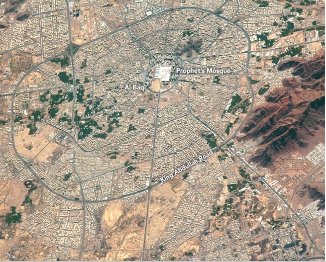 Un astronauta a bordo de la Estación Espacial Internacional, o ISS, enfocó una cámara de alta resolución en la ciudad de Medina (Madinah en documentos oficiales) al oeste de Arabia Saudita.