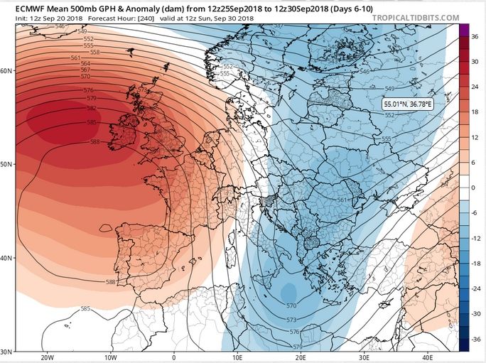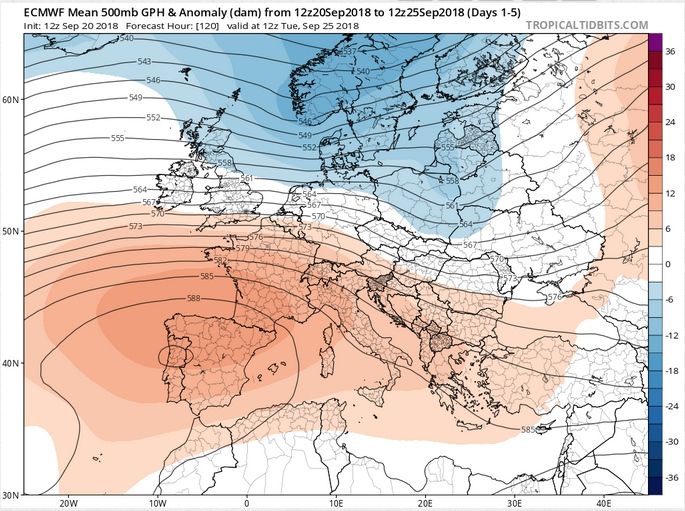 Y todo ello generado por una potente dorsal anticiclónica situada unas veces sobre la Península y otras veces algo más al oeste, como se muestra en esto mapas medios de geopotencial de 500 hPa y sus anomalías del ECMWF: