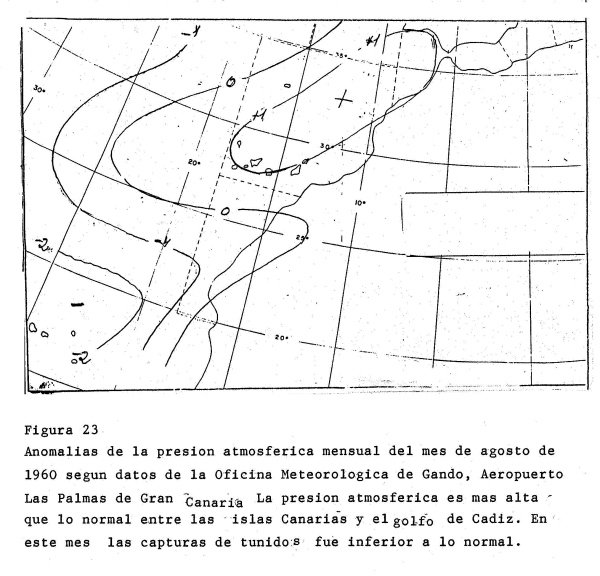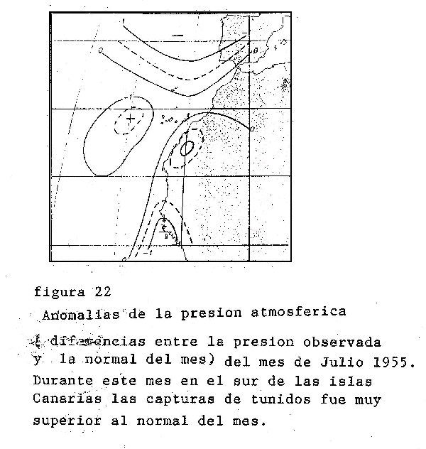 Siguiendo la técnica de Rodewald, A. Naya comprobó que las mejores capturas de túnidos, albacoras y bonitos, tienen lugar en el Sur de las islas Canarias siempre y cuando en los mapas medios de presión atmosférica al nivel del mar hay un centro de anomalías negativas ( presión atmosférica inferior al normal del mes ) entre las islas Azores, islas de Madeira y costas de la Península Ibérica., figura 22.