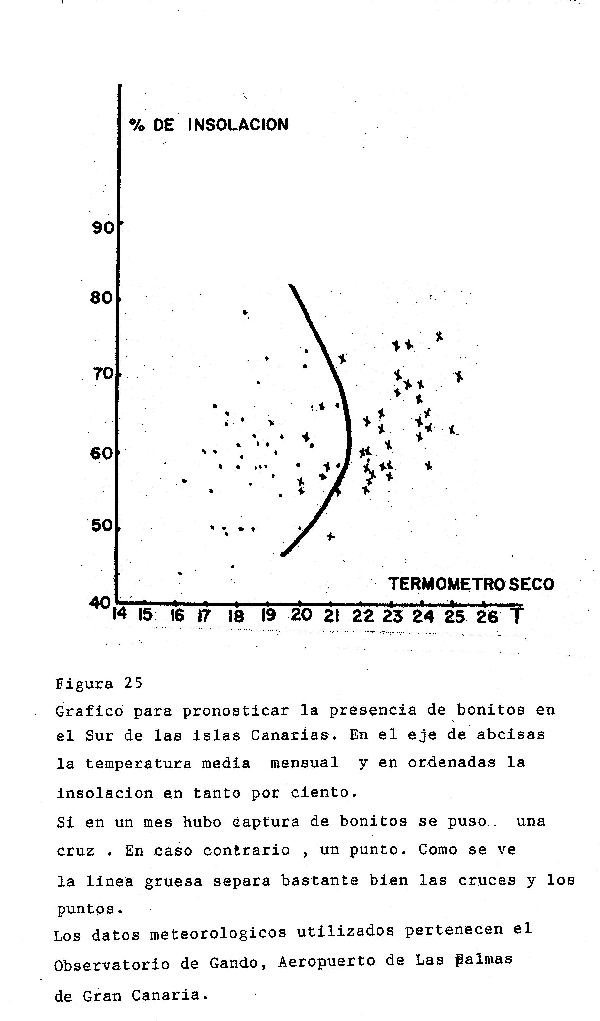 En l933, los japoneses Uda y Watanaba admiten que el paso de las tormentas origina un descenso de la temperatura del agua marina superficial y un movimiento hacia el Sur del Japón de la corriente fría de Oyashio lo que determina un movimiento hacia el Sur de las áreas de pesca del bonito. Según A. Naya era sospechoso de que se pudiera pronosticar la presencia de sardinas en el Sur de Gran Canaria utilizando datos de la evaporación del Observatorio de Gando, Gran Canaria. Por esta razón intentó elaborar un grafico para la el pronostico de bonitos, figura 25.