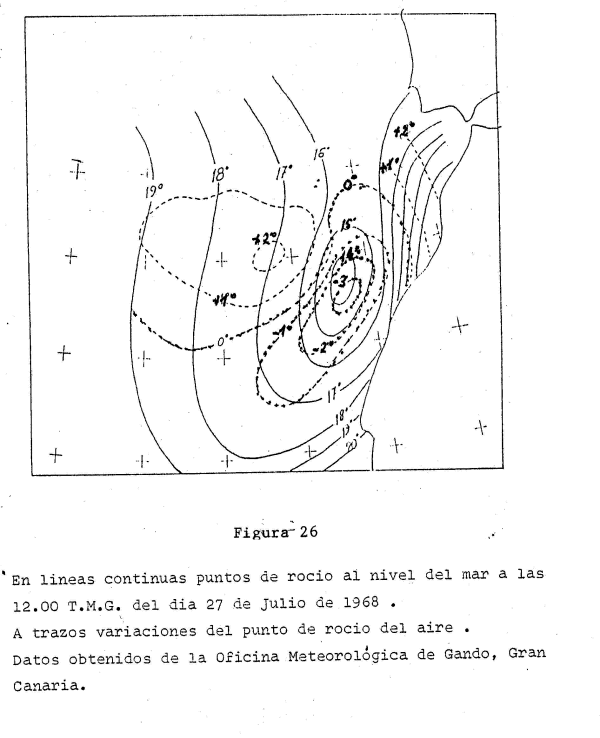 En la figura 26 tenemos un mapa cuyas líneas continuas unen los puntos de igual temperatura de rocío en las ultimas 24 horas; El centro negativo de –3ºC denota que el aire esta sujeto a un movimiento vertical que transporta el calor del océano a la atmósfera. Podemos estar seguros que se ha producido un upwelling en el océano próximo a Canarias.