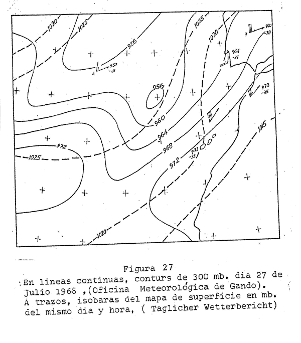 En la figura 27 correspondiente al DIA 27 de Julio de l968 tenemos una topografía de 3OO milibares ( sus líneas denotan la dirección del viento a unos 9OOO metros de altura ) En este mapa vemos una depresión al Oeste de Canarias. Al entrar los vientos del SW de esta depresión en altura en las inmediaciones de Canarias origina los movimientos verticales citados. Estos mapas fueron confeccionados en la Oficina Meteorológica del Aeropuerto de Las Palmas de Gran Canaria, Gando y con el boletín europeo Taglicher Wettebericht.