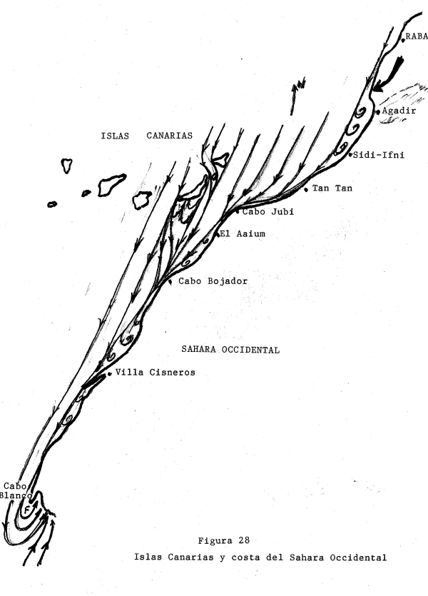 Los globos que lanzábamos para conocer la dirección del viento en altura pude saber que cerca de unos 2OO metros sobre el suelo el viento era muchas veces del Este y Este-Nordeste, es decir seco y cálido por venir del interior del Sahara. Esto significaba que la evaporación era intensa en las aguas que bañan la costa de Agadir a Cabo Blanco pasando por Villa Cisneros.