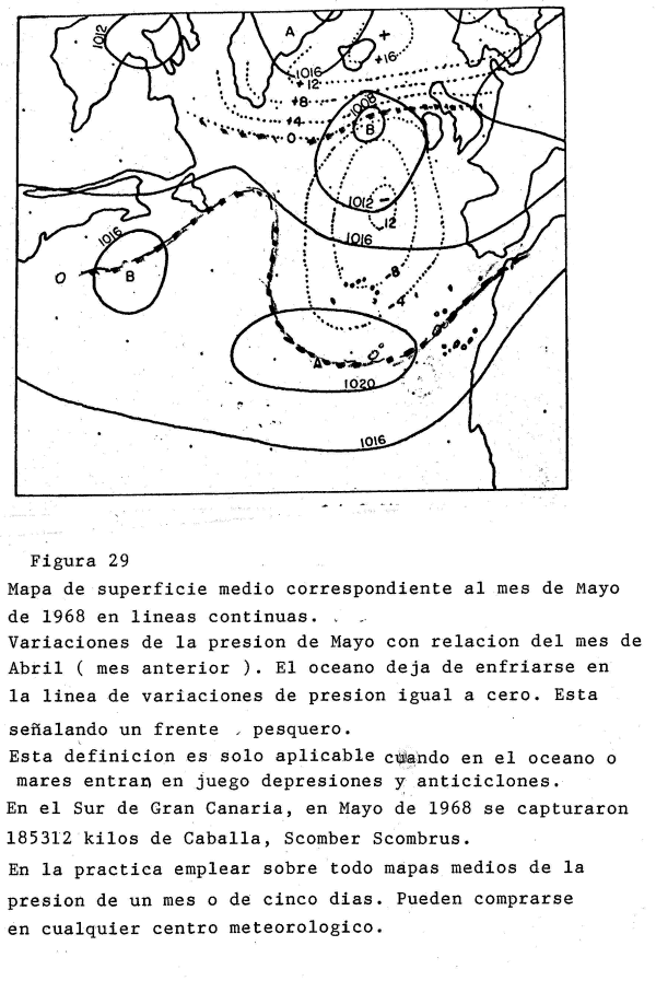 En la figura 29 tenemos el mapa medio de isobaras del mes de Mayo de l968 en líneas continuas. En líneas a puntos las variaciones de la presión atmosférica de Mayo con relación al mes de Abril. El océano deja de enfriarse cerca de la línea cero que pasa cerca de Canarias. En ese mes de Mayo las capturas de caballa, Scomber Scombrus, fueron muy por encima de lo normal. Podríamos hablar de un frente pesquero secundario en la línea de variaciones –4 que pasa cerca de Azores.