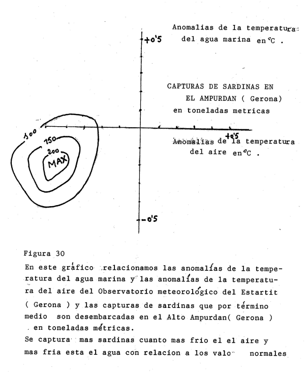 En la figura 30 relacionamos las anomalías de temperatura del aire y las de la temperatura del agua marina superficial en Estartit, Gerona y las toneladas de sardinas desembarcadas por termino medio durante los 12 meses del año en Palamos, Gerona. Hay un máximo de capturas de sardinas con temperaturas mas frías que lo normal en el agua marina y en el aire. Opinamos que las máximas capturas se presentan después de una tormenta, cuando cesa la tormenta.