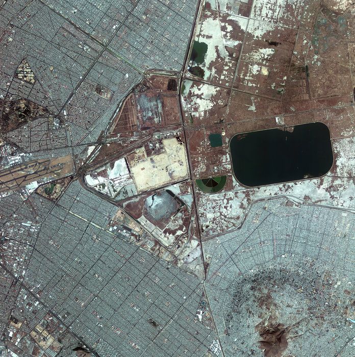 Esta fotografía captura parte de la alta meseta del centro de México, conocida como el Valle de México. Hace tiempo esta zona estaba cubierta por las aguas del Lago Texcoco, que se ha ido drenando con el paso de los siglos. Las zonas no construidas están dedicadas a la gestión hidrológica y contienen diversos embalses y estanques, como el gran Lago Nabor Carrillo, que se puede ver de color oscuro.