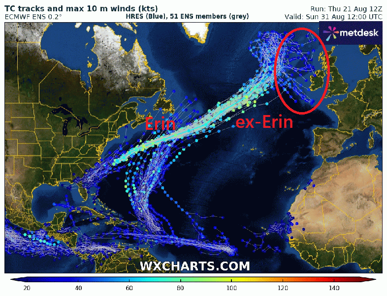 Como vemos, las predicciones se complican con la entrada de ex-Erin cerca de la Península durante la segunda parte de la semana venidera, a partir del 27 de agosto, miércoles. En principio hay cierta confianza de que la borrasca se desplace hacia el oeste y noroeste de las islas británicas, pero en un giro y bucle llamativo el centro de ex-Erin pasaría hacia el sur-sureste, afectando al oeste de Francia y al norte de la península ibérica algo más debilitado.