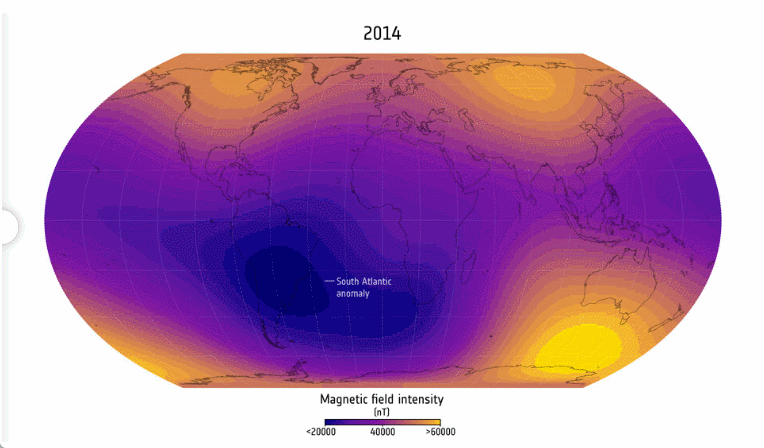 La Agencia Espacial Europea, ESA, ha descubierto que la región débil del campo magnético de la Tierra sobre el Atlántico Sur, conocida como Anomalía del Atlántico Sur, se ha expandido enormemente desde 2014.