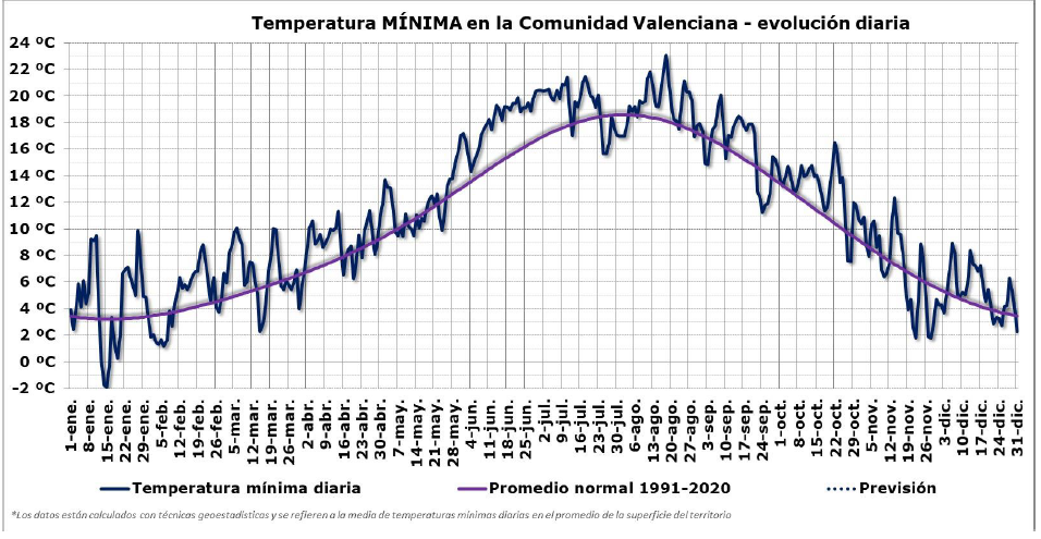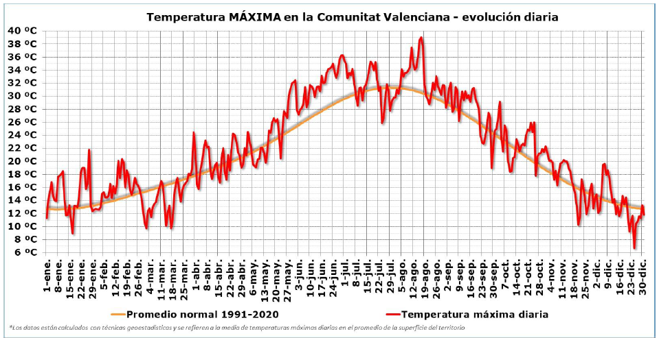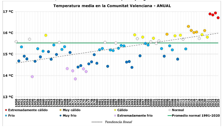 Los cuatro años más cálidos en la Comunitat Valenciana son los cuatro últimos, por este orden de más a menos cálido, 2024, 2022, 2023 y 2025 y, de los diez años más cálidos, todos son años del siglo XXI, de los cuales nueve a partir de 2014.