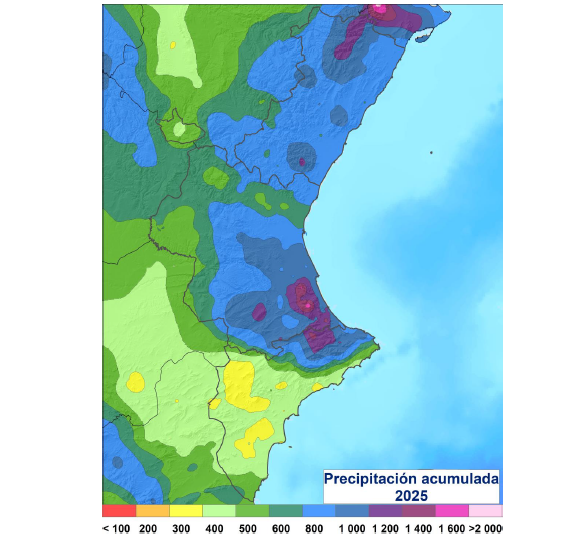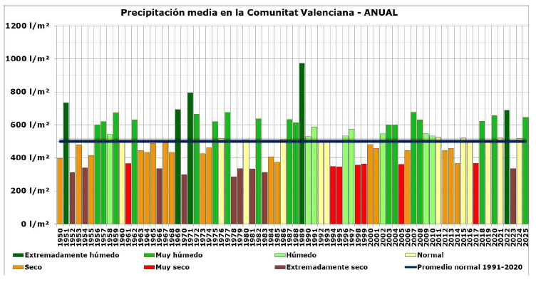 La temperatura media de 2025 en la Comunitat Valenciana fue 1.2 °C superior a la del promedio climático normal y la precipitación un 30 % superior. Es el cuarto año más cálido desde que hay registros y el undécimo más húmedo.
