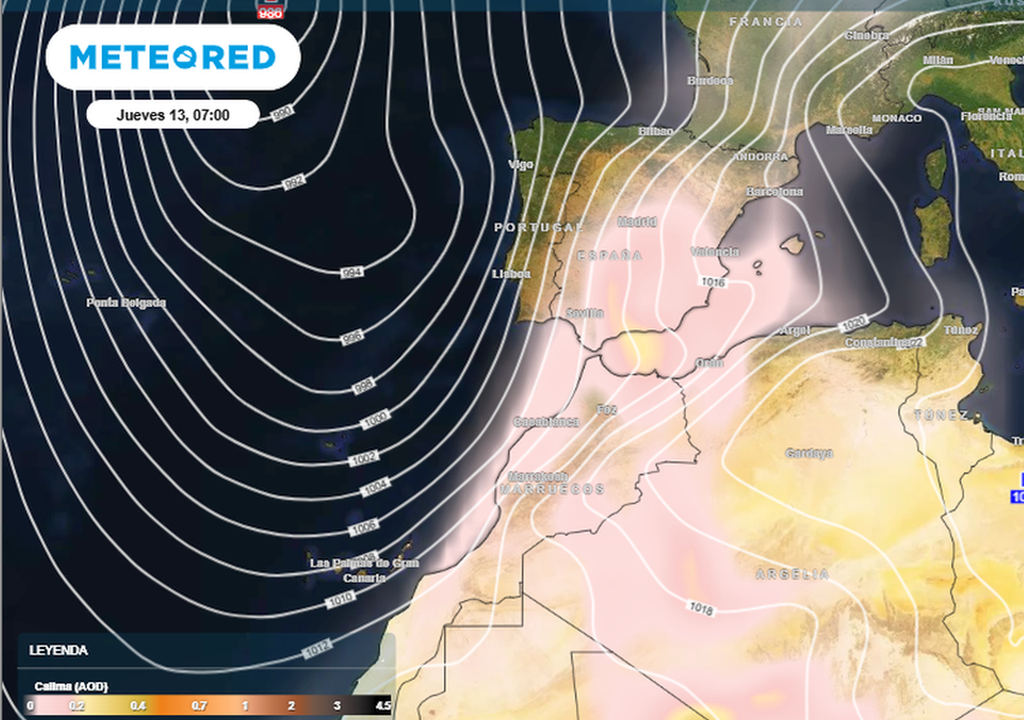Mientras esto ocurre, los vientos del sur llevarán a la Península temperaturas más suaves y más altas de lo normal, cargadas de polvo en suspensión de origen africano, dejando los cielos sucios y turbios.