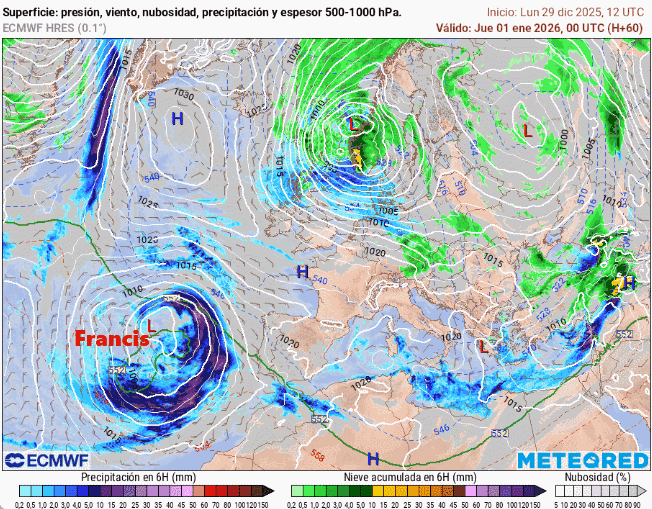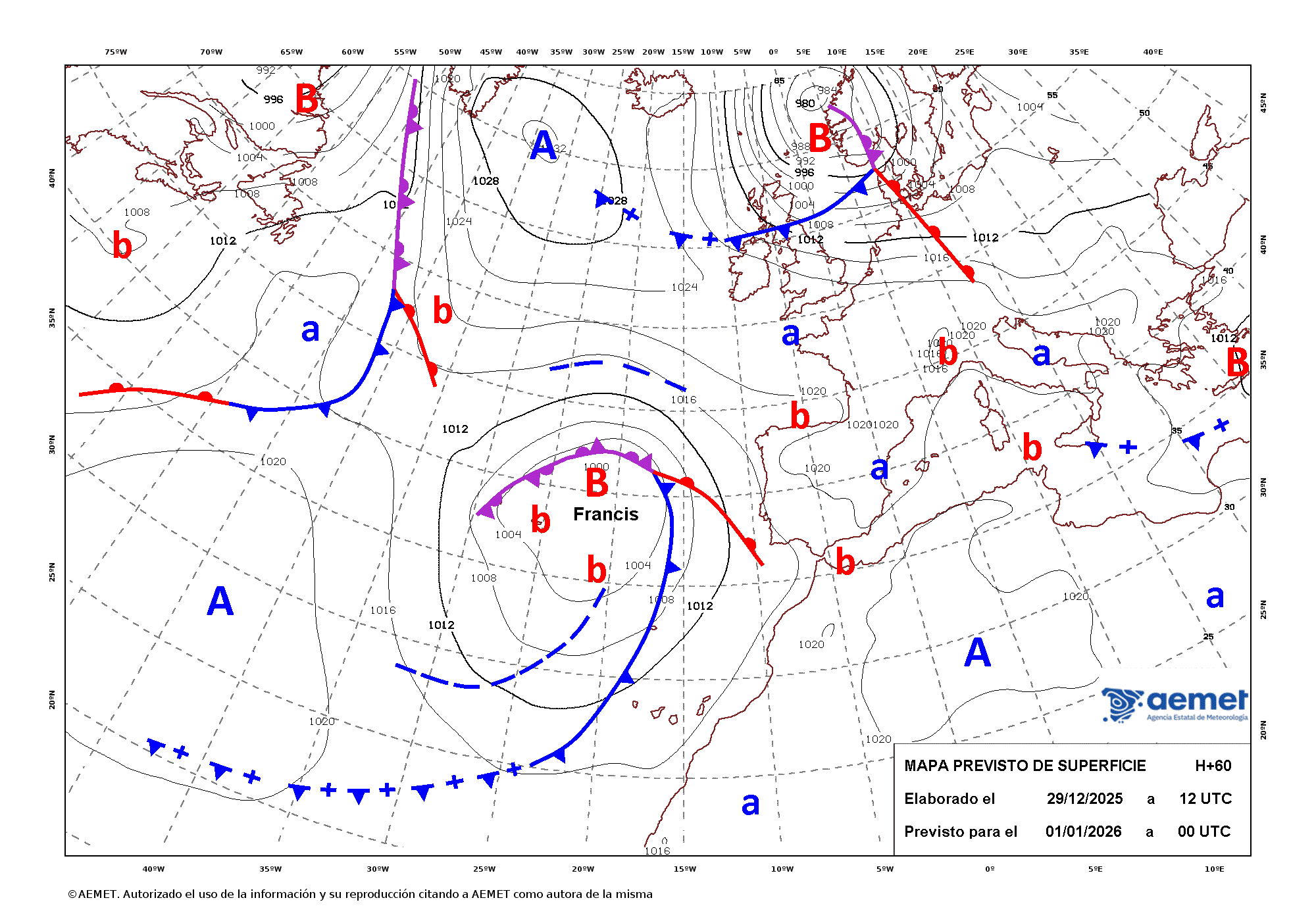Francis será una borrasca atlántica de alto impacto que se formará entre el 30 y 31 de diciembre de 2025 lejos de las costas peninsulares. En su flanco oeste-suroeste estará conducida por vientos máximos en altura que la acercarán a la Península por el oeste.