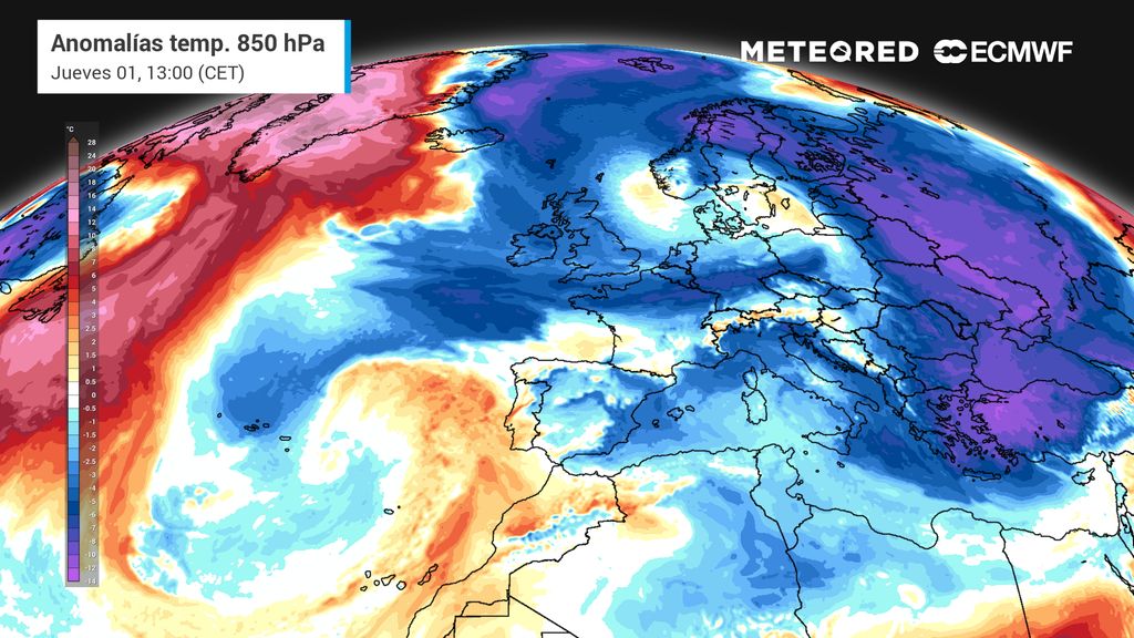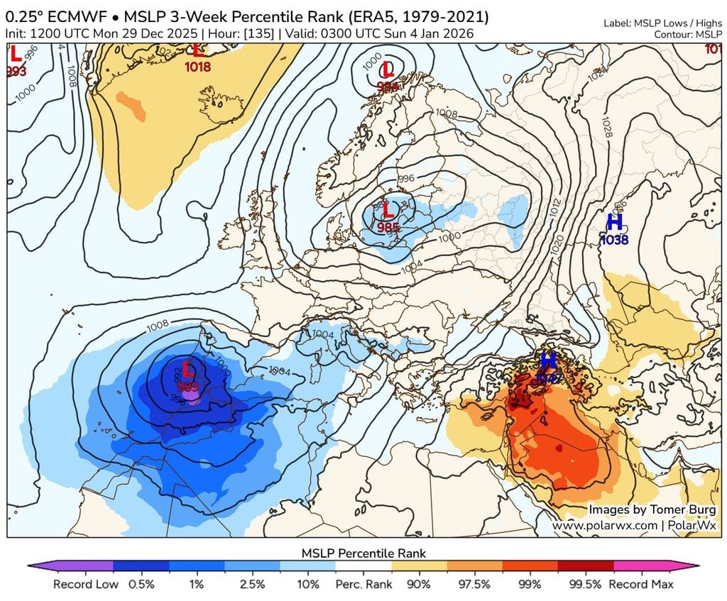 La borrasca se profundizará y generará un frente frío muy activo que sobre el 1 de enero podría afectar de lleno a Canarias, especialmente a las islas más occidentales de mayor relieve. El frente frío hará bajar las temperaturas en Canarias con acumulados de lluvia significativos.