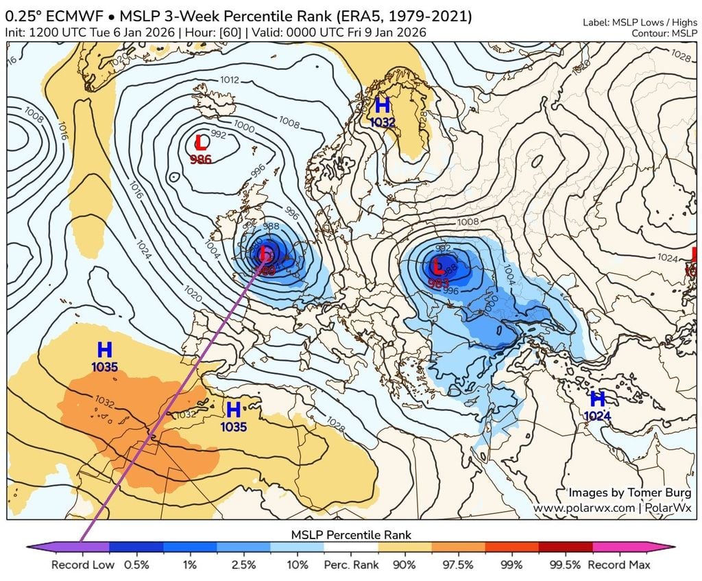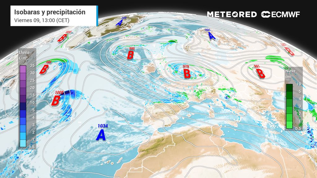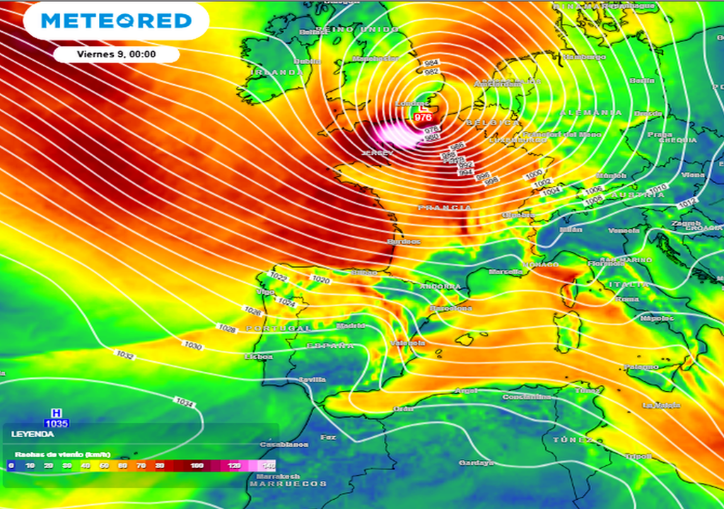 Una potente y profunda borrasca se va a desarrollar en el Atlántico Norte en proceso de rápida profundización. Mientras esto ocurre, cruzará el sur del Reino Unido y el norte de Francia entre el jueves por la noche, 8, y el viernes, 9 de enero de 2026 por la tarde, trayendo un temporal de mala mar, viento, rachas muy intensas, lluvia y nieve.