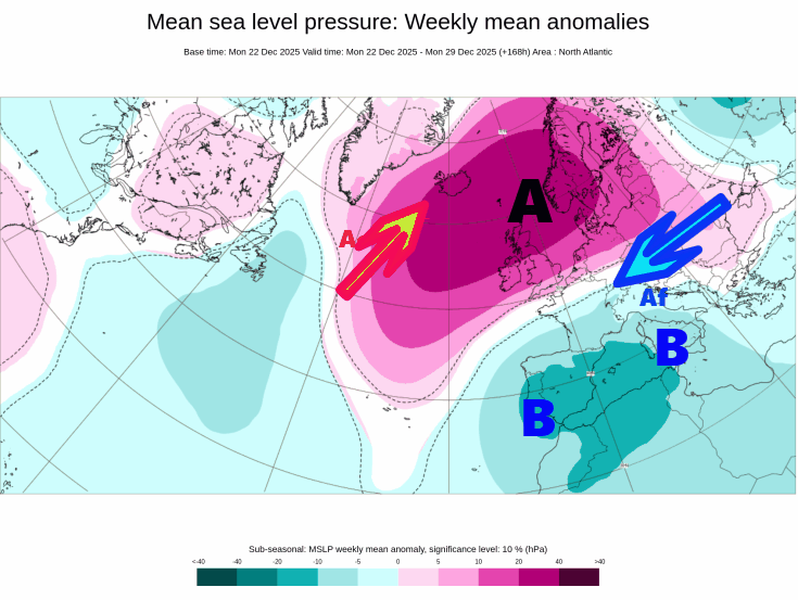 Durante estos días de Navidad, en particular desde el 21 de diciembre, el aire frío ha comenzado a fluir hacia Europa Central y Occidental procedente del este. Este hecho se debía y se debe al pasillo de aire muy frío formado por el anticiclón de bloqueo escandinavo-inglés, A, y las borrascas ubicadas en la zona del Mediterráneo, B. Este flujo frío del noreste, Af, de niveles bajos y origen continental se mantendrá los próximos días, llegando incluso a fin de año.