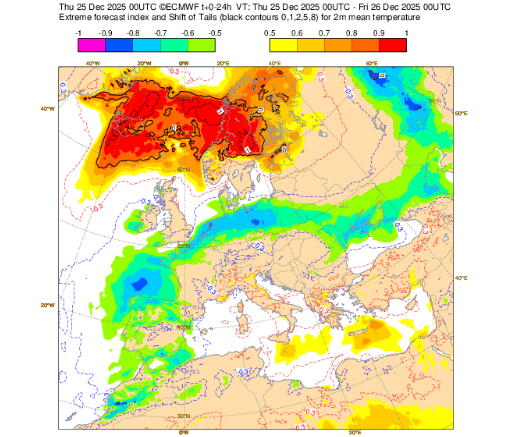 La rareza de la situación la marca el índice EFI de temperaturas para hoy y días venideros (no mostrados aquí). Este índice para la temperatura oscila entre 1 para el grado de rareza de temperaturas altas y -1 para las más bajas en la zona analizada. Nótese los valores de 1 (rojo) en las zonas de Islandia y centro-norte de Escandinavia, mientras se dan valores de cerca de -1 en nuestras latitudes en escala de azules.