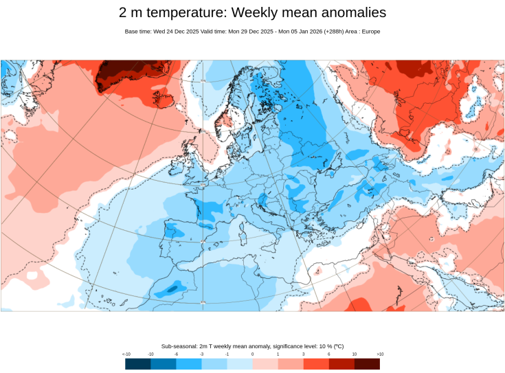 A principios del nuevo año, la mayor parte de Europa quedará en el ramal descendente-frío y experimentará temperaturas por debajo de la media, con heladas durante todo el día en muchas áreas.