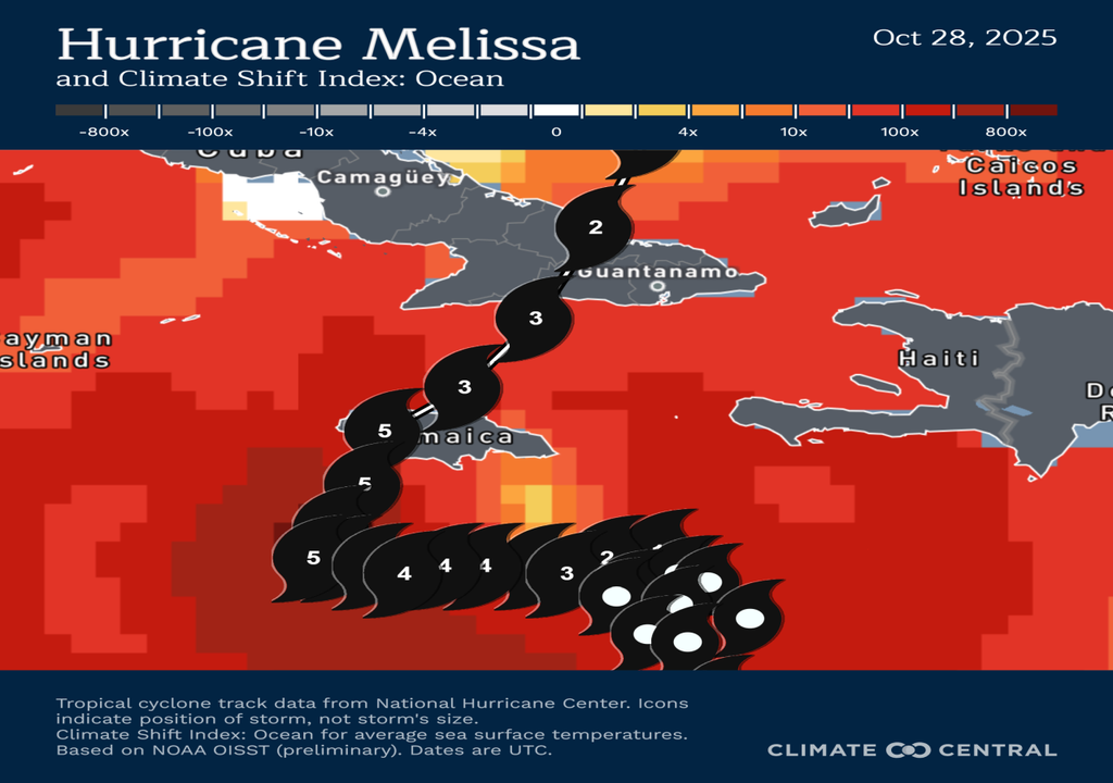 - En el Caribe central, las temperaturas de la superficie del mar (TSM) están 1,4 °C por encima del promedio para mediados y finales de octubre, lo que proporciona energía térmica adicional que está intensificando a Melissa. A lo largo de toda la trayectoria de la tormenta, la probabilidad de que se produzcan temperaturas de la superficie del mar excepcionalmente cálidas es al menos entre 500 y 800 veces mayor debido al cambio climático provocado por el ser humano. Ver siguiente figura.