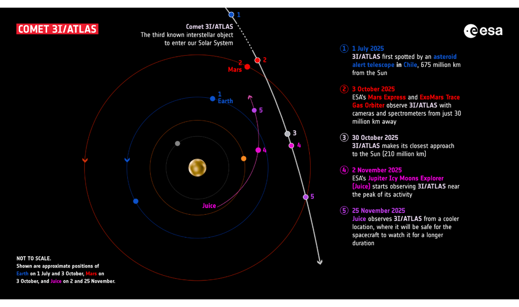 Entre el 1 y el 7 de octubre de 2025, las sondas Mars Express y ExoMars Trace Gas Orbiter observarán el cometa a su paso cerca de Marte; la distancia más cercana entre la nave espacial y el cometa será de 30 millones de kilómetros el 3 de octubre.