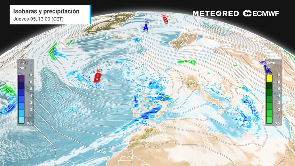 Para España, el anticiclón de las Azores, Az, se ha retirado muy al sur dejando un pasillo libre para que los trenes de borrascas, B, con sus abundantes precipitaciones afecte de lleno a la Península.