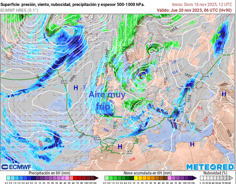 Este aire muy frío llegaría al norte de la Península sobre el 20 de noviembre y persistiría durante el 21, cuando la cota de la nieve baje casi a ras del suelo en algunas zonas septentrionales. Es posible que la nieve, nieve húmeda o aguanieve se observen en zonas próximas a la costa del extremo norte y se acumulen importantes cantidades de nivel en zonas medias y altas del sistema Cantábrico.