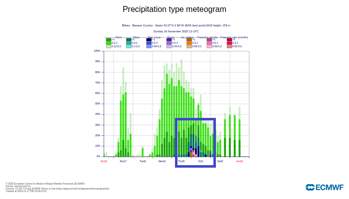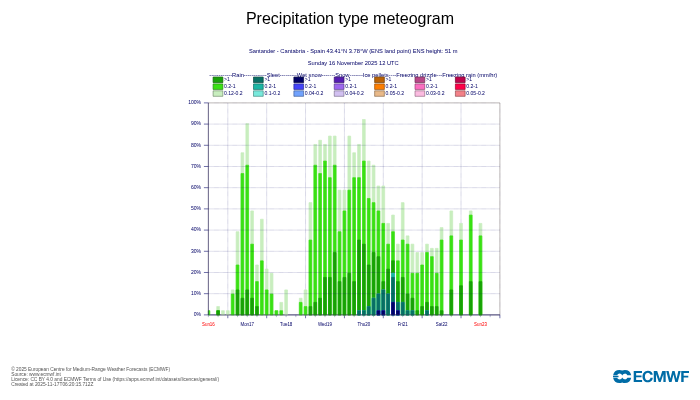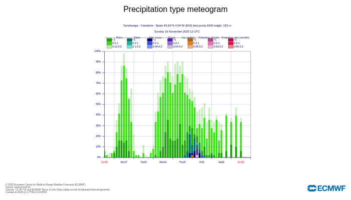 Las figuras de arriba representan la probabilidad de tipo de precipitación en varias poblaciones del extremo norte. Recordar que este producto se deriva de un conjunto de ejecuciones del modelo más un control. El gráfico muestra la probabilidad de diferentes tipos de precipitación (en %) dividida en categorías de tasa de precipitación (en mm/hora) en una ubicación determinada durante los próximos siete días.