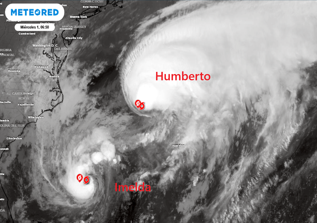 Actualmente el NHC está vigilando a estos dos huracanes por su extraordinaria cercanía nunca vista en la era de los satélites. Son Imelda y Humberto, que realizan una danza única y cercana, que terminará con uno de ellos.