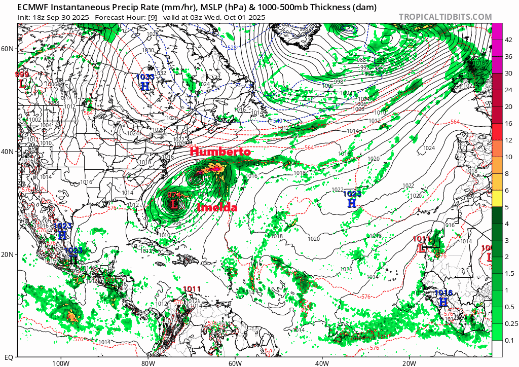 El experto Michael Lowry @MichaelRLowry indicaba en un tuit del martes pasado, 30 de septiembre de 2025, que Imelda y Humberto, ambos huracanes, están a menos de 800 km/500 millas de distancia esa mañana.