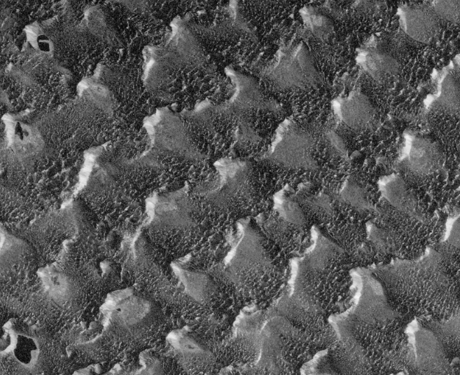En esta imagen de radar de septiembre de 2025, el efecto dominó denota la alta densidad de dunas de arena paralelas, incluyendo algunas de las más altas del mundo, una de las cuales alcanza la altura récord de 460 m, más alta que el Empire State Building. Aunque la mayoría de las dunas son dinámicas debido al movimiento de arena, las megadunas más altas suelen ser estacionarias, con un núcleo sólido, y en invierno están cubiertas de nieve.