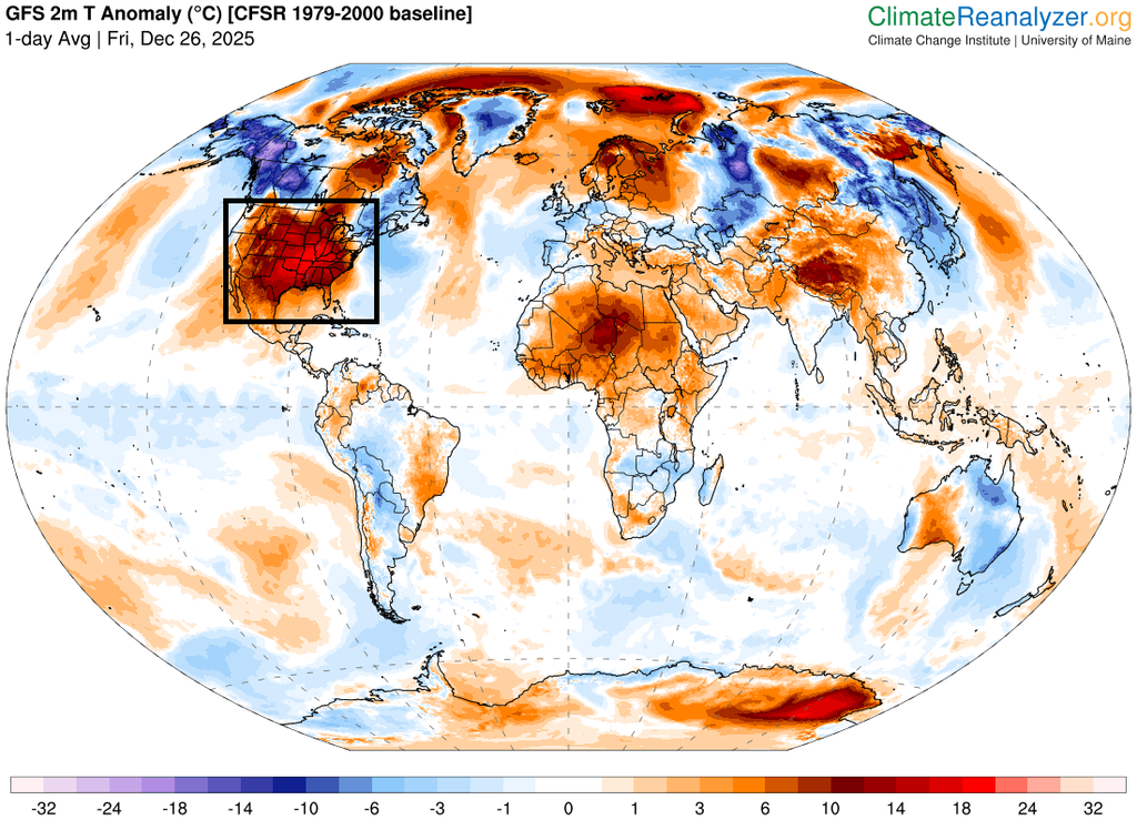 Millones de personas en EE.UU. continentales han vivido las navidades más cálidas jamás registrada en el país con anomalías térmicas entre 20-24 ºC y temperaturas máximas superando ampliamente los 20-25 ºC en ciertas zonas, batiéndose multitud de récords de temperaturas máximas y mínimas altas.