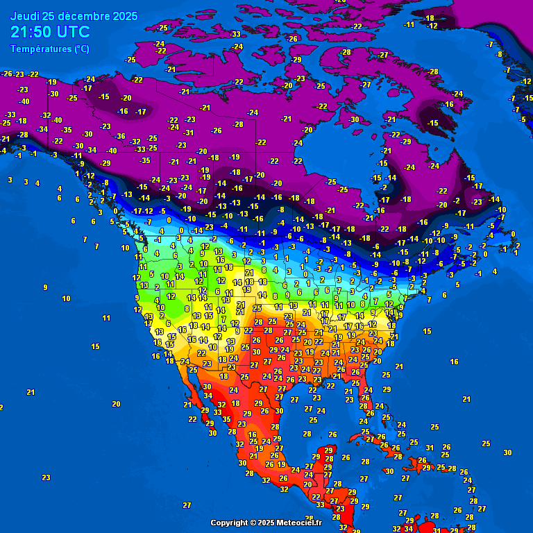 Temperaturas a fecha de 25 de diciembre de 2025 a las 21:50 UTC en Norteamérica. Fuente: Meteociel.fr