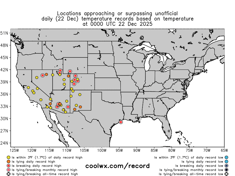 Según informan diferentes medios de comunicación, ya desde el lunes, 22 de diciembre, se igualaron o batieron récords históricos de calor en diciembre en Lubbock, Texas (29 °C); North Platte, Nebraska (26 °C); y Tucson, Arizona (29 °C).