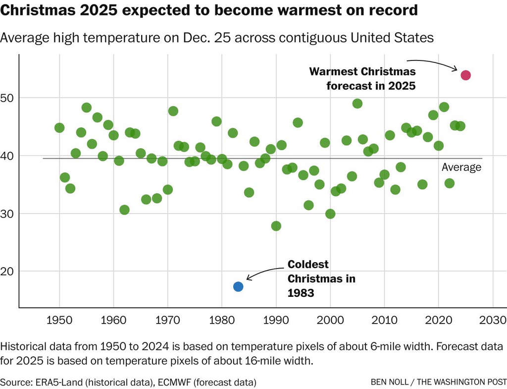 Con los datos provisionales observados y previstos, el experto Ben Noll ha confirmado en su cuenta de X que: " esta Navidad de 2025 se prevé que se convierta en la más cálida de la historia en todo Estados Unidos. Una temperatura máxima promedio pronosticada de 53,9 grados F (12,2 ºC) la haría la más cálida con un amplio margen, superando el récord de 49 grados (9,4 ºC) en 2005. Una temperatura mínima promedio de 39,7 grados (4,3 ºC) también sería la más alta de la historia".