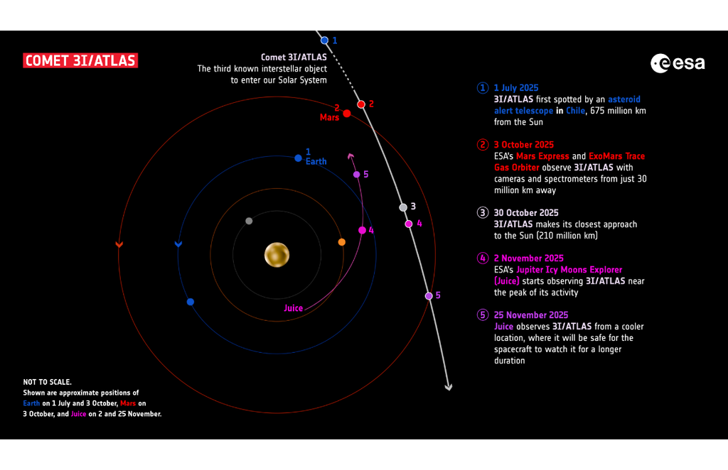 Actualmente, el cometa está siendo observado con el Explorador de las Lunas heladas de Júpiter (Juice). Aunque Juice se encuentra más lejos de 3I/ATLAS que los orbitadores de Marte el mes pasado, está observando el cometa justo después de su máximo acercamiento al Sol, cuando se encuentra en un estado de mayor actividad. No se espera recibir datos de las observaciones de Juice hasta febrero de 2026.