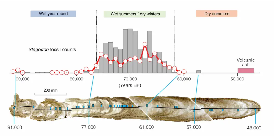 Científicos de la Universidad de Wollongong (UOW) formaron parte del equipo de Australia e Indonesia que dirigió la investigación, que combinó registros químicos precisos de estalagmitas de cuevas con datos isotópicos de dientes fósiles del Stegodon, una especie de elefante pigmeo. Los resultados revelan una extensa tendencia a la sequía que comenzó hace unos 76.000 años y culminó en una grave sequía estival entre hace 61.000 y 55.000 años.