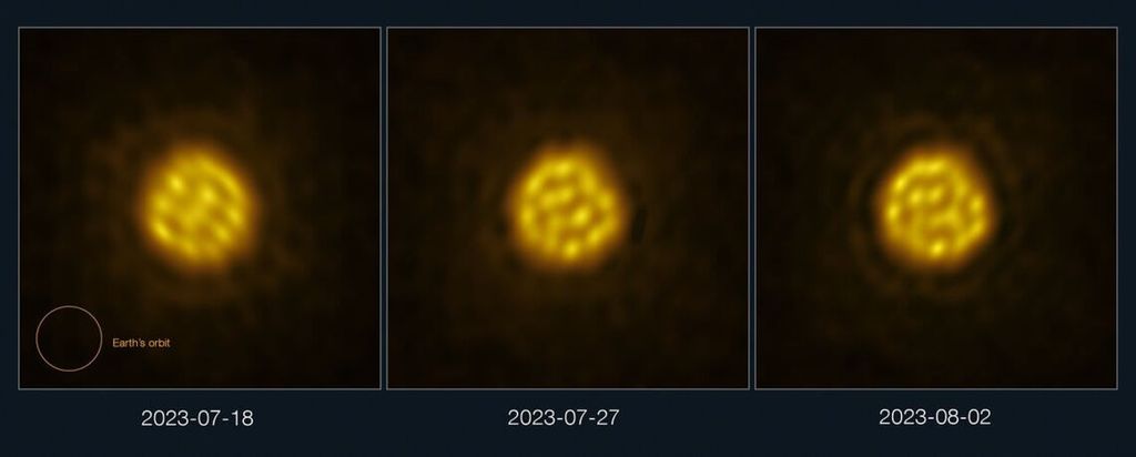 Las imágenes de la estrella, R Doradus, se obtuvieron en julio y agosto de 2023 con el Atacama Large Millimeter/submillimeter Array (ALMA), un telescopio del que ESO es socio. El panel de abajo muestra tres de estas imágenes reales, tomadas con ALMA el 18 de julio, el 27 de julio y el 2 de agosto de 2023. Las burbujas gigantes que se ven en la superficie de la estrella, 75 veces del tamaño del Sol, son el resultado de movimientos de convección dentro de la estrella. El tamaño de la órbita de la Tierra se muestra a escala. Crédito: ALMA (ESO/NAOJ/NRAO)/W. Vlemmings et al.