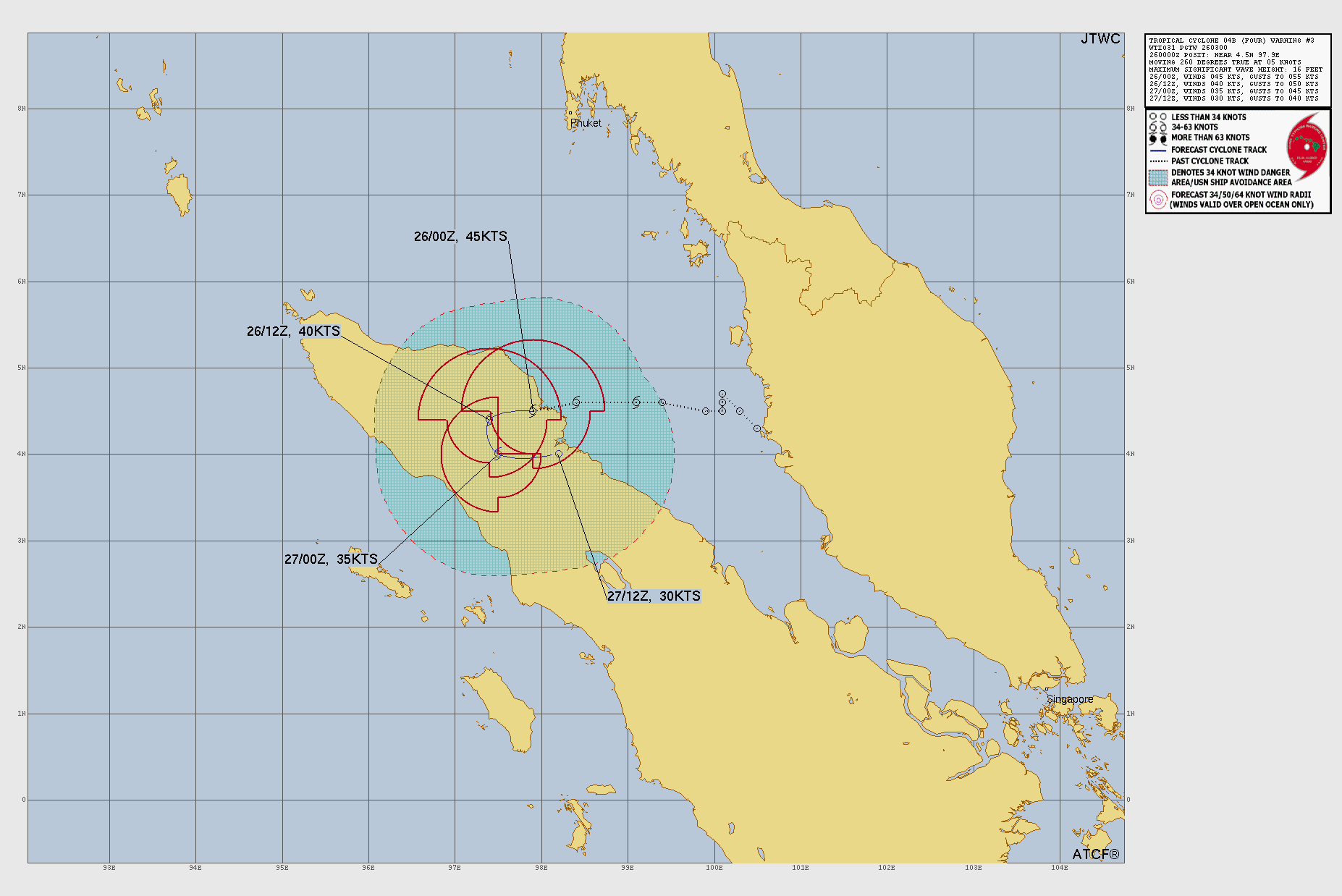 El ciclón se encuentra actualmente en el estrecho de Malaca y se mueve hacia el oeste hacia el norte de Sumatra. Se espera que toque tierra más tarde hoy en la península más septentrional de Sumatra del Norte, cerca de Medan, con velocidades del viento proyectadas entre 80 y 90 km/h. Además, se prevén inundaciones costeras y tierra adentro potencialmente dañinas.