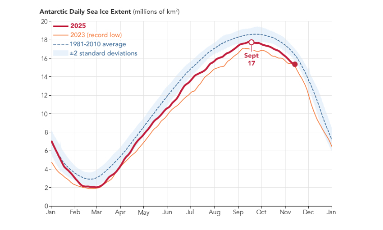 Conforme el invierno de 2025 aflojaba su dominio sobre el hemisferio sur, el hielo marino alrededor de la Antártida continuó extendiéndose por la superficie del océano. El 17 de septiembre alcanzó su máxima extensión anual, si bien este pico se mantuvo relativamente bajo en comparación con los niveles observados antes de 2016.