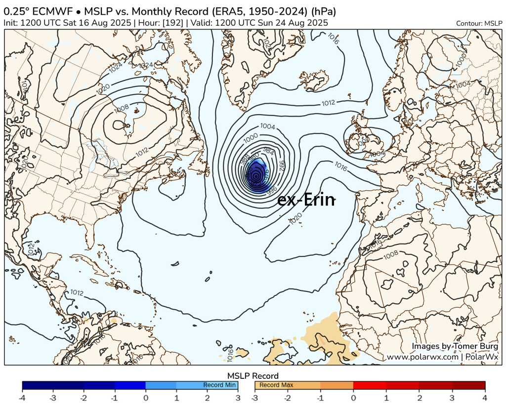El 16 de agosto de 2025, el huracán Erin se intensificó rápidamente a categoría 5 con vientos sostenidos de más de 259 km/h y podría ser, posteriormente, la borrasca más profunda que ha surcado el Atlántico Norte en agosto tras sufrir un proceso de transición extratropical hacia Europa.