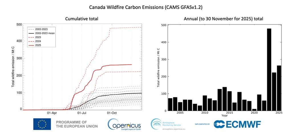 Los incendios forestales extremos persistieron en las regiones boreales de América del Norte en 2025. En Canadá, los incendios forestales liberaron alrededor de 250 megatoneladas de carbono hasta el 1 de octubre, lo que representa su segundo mayor nivel de emisiones anuales y el tercer año consecutivo de actividad excepcional de incendios forestales. El humo de estos incendios forestales cubrió repetidamente extensas zonas de Norteamérica y en varios casos el humo se propagó a través del Atlántico Norte hacia Europa y más allá.