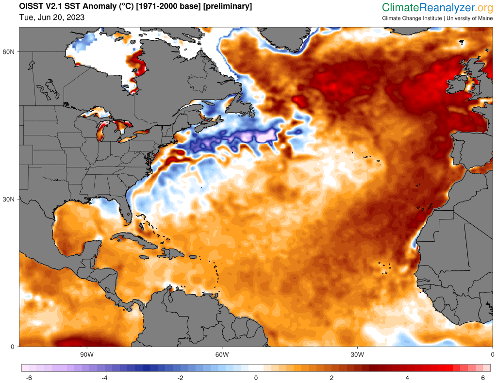 Según el experto Dr. Simon Lee, la ola de calor marina extrema que se está produciendo en el Atlántico nororiental coincide con una circulación superficial anómalamente anticiclónica durante el último mes. Esto está asociado con un desplazamiento inusual hacia el norte del anticiclón de las Azores (normalmente centrado cerca de ~30°N, 40°W).