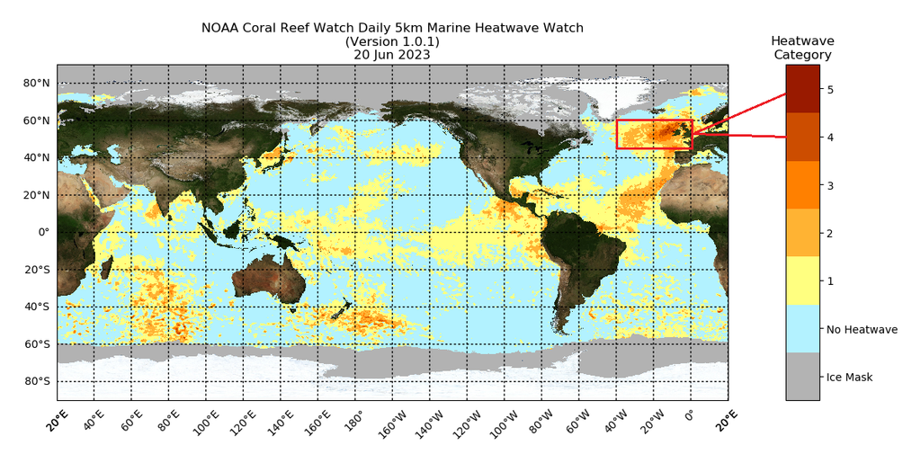 Olas de calor marinas en los océanos y sus categorías a fecha de 20 de junio de 2023, destacando las zonas analizadas en este artículo. NOAA