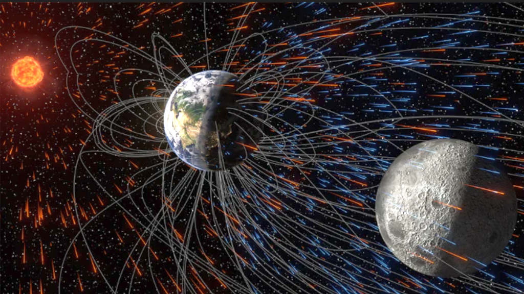 Las partículas cargadas, expulsadas de la atmósfera superior por el viento solar, pueden viajar a lo largo de las líneas del campo magnético que se extienden a lo largo del espacio, alcanzando la superficie lunar e incrustándose en el regolito lunar.