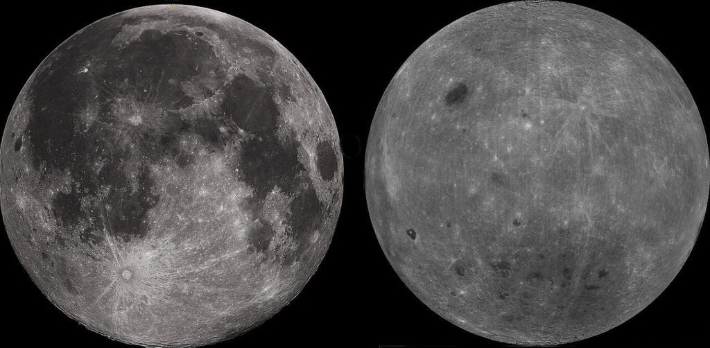 El lado opuesto tiene una corteza más gruesa, es más montañoso y lleno de cráteres y parece haber sido menos volcánico, con menos manchas oscuras de basalto formadas a partir de lava antigua.
