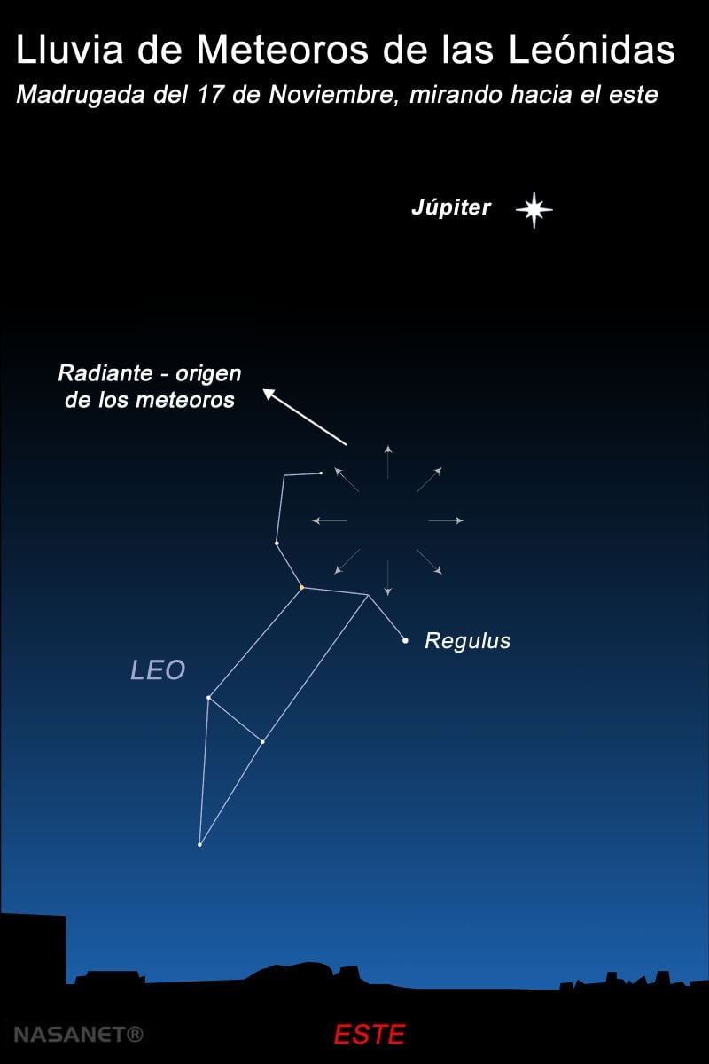 Aunque la actividad de la Leónidas se extiende desde principios de noviembre hasta comienzos de diciembre, su pico máximo de observación o el momento de mayor intensidad será la noche del 16 al 17 de noviembre, especialmente durante la madrugada, cuando el punto radiante —situado en la constelación de Leo— asciende en el cielo y los meteoros se vuelven más visibles, según informa NASANET.