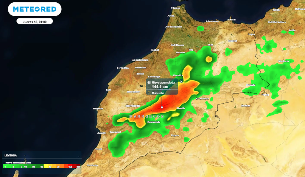 Estas nevadas tienen un protagonista importante y son las montañas de la cordillera del Atlas, donde los picos pueden superar los 4.000 metros. La orientación, la altura y la dirección del flujo de aire que arrastrarán los frentes fríos harán que se produzca un realce orográfico que favorezca las precipitaciones en general y las nevadas en particular.