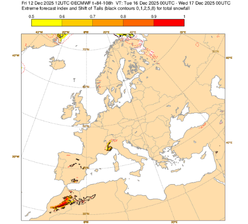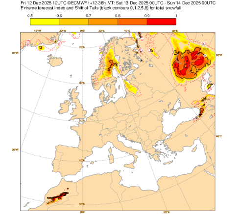 Estos hechos son relativamente raros, como muestran los índices normalizados de rarezas de la nieve para dos días concretos, 13 y 16 de diciembre de 2025, EFI:
