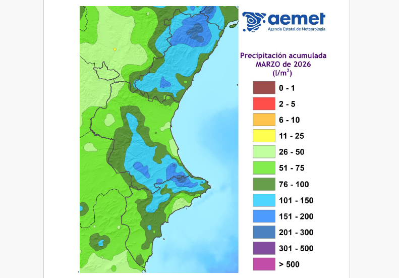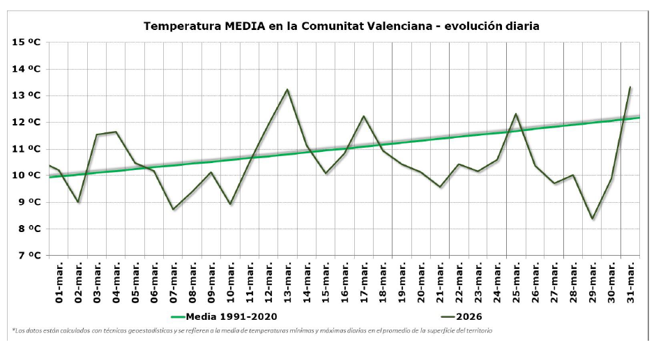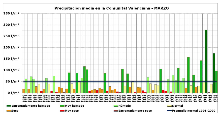 El mes de marzo de 2026 ha tenido la anomalía fría más acusada en la Comunitat Valenciana desde febrero de 2023. La precipitación acumulada ha sido 97.4 l/m2, que es el doble que la del promedio climático del periodo 1991-2020.